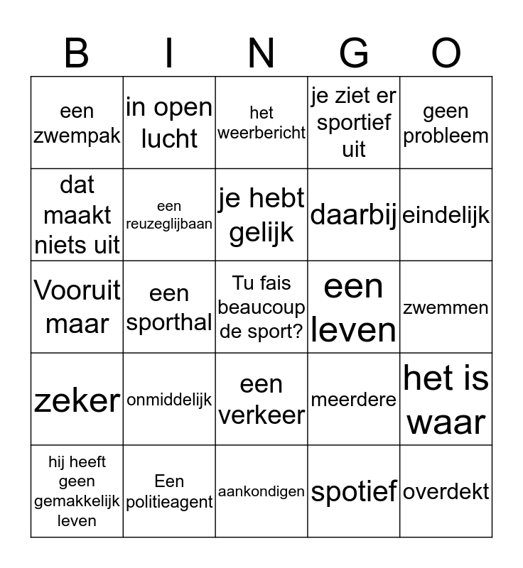 This bingo card has a free space and 30 words: Een politieagent, een zwembad, een sporthal, een zwembroek, een zwempak, het weerbericht, een reuzeglijbaan, een verkeer, een leven, aankondigen, zwemmen, overdekt, spotief, nogal, eindelijk, overal, meerdere, zeker, onmiddelijk, geen probleem, Vooruit maar, Welk weer kondigt men aan, in open lucht, daarbij, dat maakt niets uit, je ziet er sportief uit, het is waar, hij heeft geen gemakkelijk leven, je hebt gelijk and wat een verkeer.