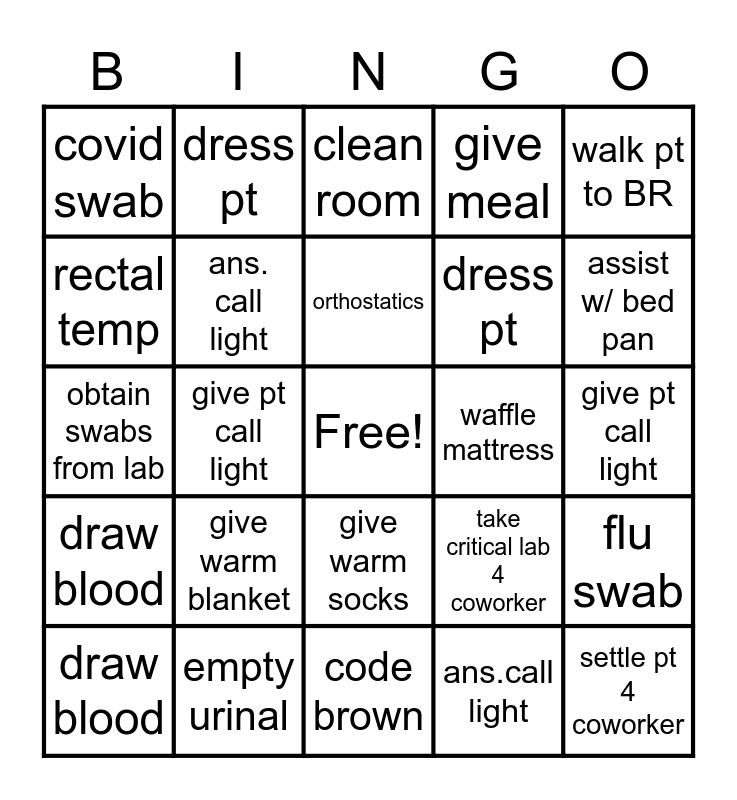 This bingo card has a free space and 25 words: draw blood, empty urinal, code brown, ans.call light, walk pt to BR, covid swab, dress pt, clean room, waffle mattress, flu swab, rectal temp, ans. call light, help a coworker w task, take critical lab 4 coworker, assist w/ bed pan, draw blood, give pt call light, orthostatics, dress pt, give pt call light, obtain swabs from lab, give warm blanket, give warm socks, give meal and settle pt 4 coworker.
