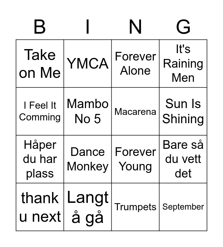 This bingo card has 47 words: Pokemon Theme, thank u next, Händerna mot himmelen, Hakuna Matata, Fy Faen, Sexbomb, YMCA, Sweet Home Alabama, Mambo No 5, Summer of 69, Macarena, It's Raining Men, Dancing Queen, Walking On Sunshine, Feel It Still, Walkashame, Sun Is Shining, Langt å gå, Jenter, I Feel It Comming, Bare så du vett det, Boogie Wonderland, Take on Me, Håper du har plass, I'll Be There for You, Dance Monkey, I Took A Pill in Ibiza, Jens, Rude, Black or White, September, Ridin' Solo, Best når jeg er full, jeg er lei meg, Stjerner, Bohemian Rhapsody, 7 Years, Trumpets, Walking in Memphis, jeg bruker ikke kondom, Neste sommer, New Light, Forever Alone, Forever Young, Viva La Vida, Another One Bites The Dust, Grace Kelly and Lose Yourself.