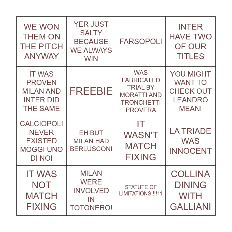 This bingo card has 16 words: MILAN WERE INVOLVED IN TOTONERO!, LA TRIADE WAS INNOCENT, FARSOPOLI, WE WON THEM ON THE PITCH ANYWAY, CALCIOPOLI NEVER EXISTED MOGGI UNO DI NOI, YER JUST SALTY BECAUSE WE ALWAYS WIN, IT WASN'T MATCH FIXING, STATUTE OF LIMITATIONS!!!!11, IT WAS PROVEN MILAN AND INTER DID THE SAME, FREEBIE, IT WAS NOT MATCH FIXING, INTER HAVE TWO OF OUR TITLES, EH BUT MILAN HAD BERLUSCONI, YOU MIGHT WANT TO CHECK OUT LEANDRO MEANI, WAS FABRICATED TRIAL BY MORATTI AND TRONCHETTI PROVERA and COLLINA DINING WITH GALLIANI.