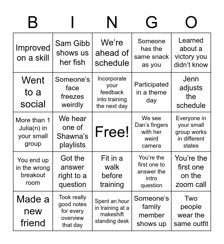 This bingo card has a free space and 24 words: Got the answer right to a question, Took really good notes for every overview that day, Incorporate your feedback into training the next day, Made a new friend, Learned about a victory you didn’t know, Improved on a skill, Went to a social, Sam Gibb shows us her fish, We see Dan’s fingers with her weird camera, Fit in a walk before training, Participated in a theme day, More than 1 Julia(n) in your small group, You’re the first one to answer the intro question, You’re the first one on the zoom call, Someone’s face freezes weirdly, Someone’s family member shows up, Everyone in your small group works in different states, We’re ahead of schedule, Jenn adjusts the schedule, We hear one of Shawna’s playlists, Two people wear the same outfit, You end up in the wrong breakout room, Someone has the same snack as you and Spent an hour in training at a makeshift standing desk.