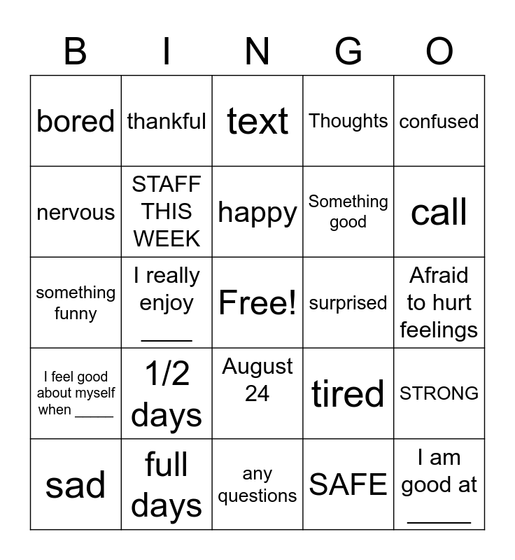 This bingo card has a free space and 24 words: 1/2 days, full days, happy, sad, confused, bored, nervous, thankful, surprised, August 24, Something good, something funny, tired, STRONG, STAFF THIS WEEK, SAFE, Afraid to hurt feelings, text, call, I really enjoy ____, I am good at _____, I feel good about myself when _____, Thoughts and any questions.