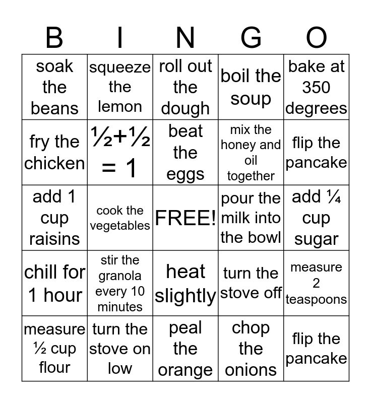 This bingo card has a free space and 24 words: stir the granola every 10 minutes, turn the stove on low, beat the eggs, measure ½ cup flour, bake at 350 degrees, soak the beans, fry the chicken, squeeze the lemon, pour the milk into the bowl, heat slightly, mix the honey and oil together, add 1 cup raisins, turn the stove off, measure 2 teaspoons, ½+½ = 1, chop the onions, add ¼ cup sugar, roll out the dough, flip the pancake, cook the vegetables, flip the pancake, chill for 1 hour, boil the soup and peal the orange.