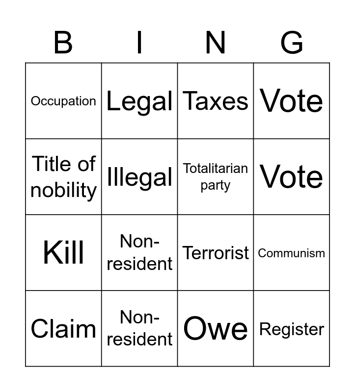 This bingo card has 24 words: Persecute, Register, Vote, Election, Title of nobility, Occupation, Illegal, Legal, Non-resident, Religion, Kill, Terrorist, Genocide, Torture, Totalitarian party, Legally incompetent, Owe, Taxes, Non-resident, Communism, Claim, Register, Vote and Title of nobility.
