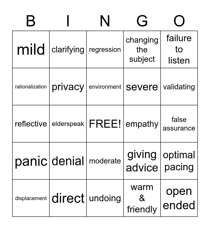 This bingo card has a free space and 24 words: denial, direct, environment, displacement, failure to listen, mild, rationalization, clarifying, empathy, moderate, severe, reflective, giving advice, optimal pacing, privacy, warm & friendly, false assurance, regression, validating, elderspeak, open ended, panic, changing the subject and undoing.