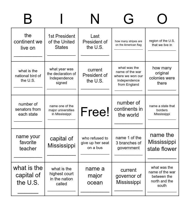 This bingo card has a free space and 24 words: what is the capital of the U.S. ______, capital of Mississippi _________, current President of the U.S. ___________, current governor of Mississippi __________, region of the U.S. that we live in _______________, the continent we live on __________, 1st President of the United States ___________, Last President of the U.S. ___________, number of continents in the world __________, name a state that borders Mississippi _______________, number of senators from each state ____________, what year was the declaration of Independence signed ______________, name 1 of the 3 branches of government ____________, name the Mississippi state flower _________, what is the national bird of the U.S. _____________, what is the highest court in the nation called ____________, name a major ocean _________, how many stripes are on the American flag __________________, how many original colonies were there ____________, name your favorite teacher __________, name one of the major universities in Mississippi _______________, who refused to give up her seat on a bus _____________, what was the name of the war where we won our independence from England ______________ and what was the name of the war between the north and the south ______________.