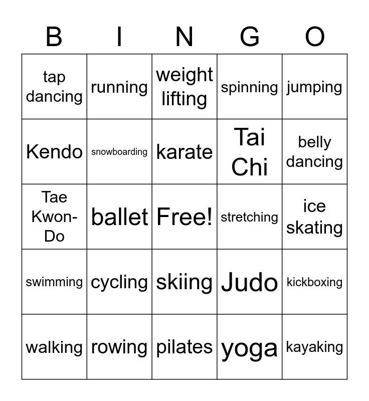 This bingo card has a free space and 25 words: cycling, pilates, karate, walking, jumping, tap dancing, Kendo, running, stretching, skiing, Tai Chi, Tae Kwon-Do, Judo, kickboxing, snowboarding, aerobics, ice skating, weight lifting, belly dancing, ballet, kayaking, rowing, swimming, spinning and yoga.