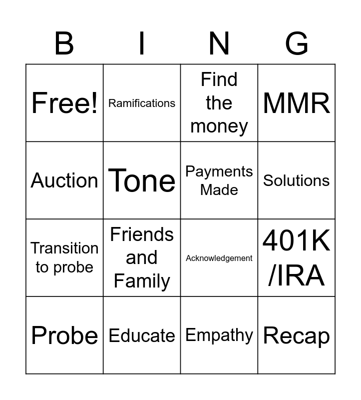 This bingo card has 16 words: Probe, Educate, Find the money, MMR, Auction, Ramifications, Acknowledgement, 401K /IRA, Free!, Tone, Empathy, Solutions, Transition to probe, Friends and Family, Payments Made and Recap.