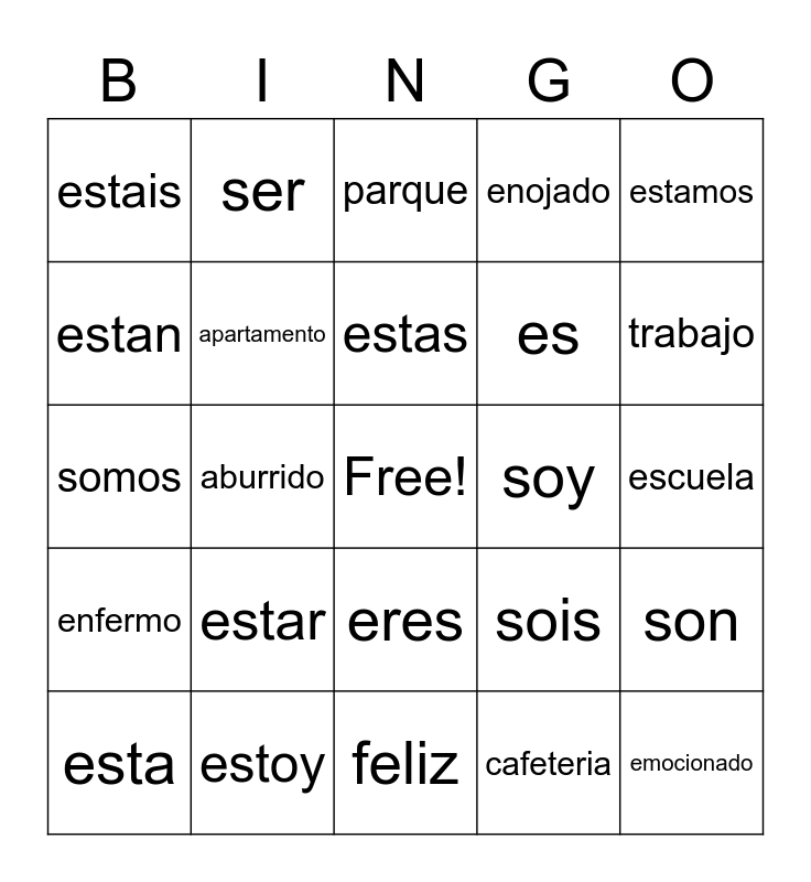 This bingo card has a free space and 24 words: estar, estoy, estas, esta, estamos, estais, estan, ser, soy, eres, es, somos, sois, son, apartamento, cafeteria, escuela, parque, trabajo, aburrido, emocionado, enfermo, enojado and feliz.