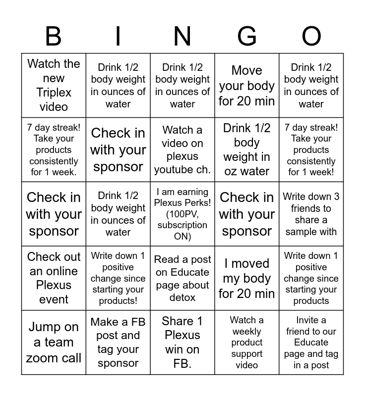 This bingo card has a free space and 24 words: Write down 1 positive change since starting your products!, Make a FB post and tag your sponsor, Watch a video on plexus youtube ch., Jump on a team zoom call, Drink 1/2 body weight in ounces of water, Watch the new Triplex video, 7 day streak! Take your products consistently for 1 week., Drink 1/2 body weight in ounces of water, Check in with your sponsor, Read a post on Educate page about detox, Drink 1/2 body weight in oz water, Check in with your sponsor, I moved my body for 20 min, Write down 1 positive change since starting your products, Check in with your sponsor, Watch a weekly product support video, Write down 3 friends to share a sample with, Drink 1/2 body weight in ounces of water, 7 day streak! Take your products consistently for 1 week!, Drink 1/2 body weight in ounces of water, Invite a friend to our Educate page and tag in a post, Check out an online Plexus event, Move your body for 20 min and Share 1 Plexus win on FB..