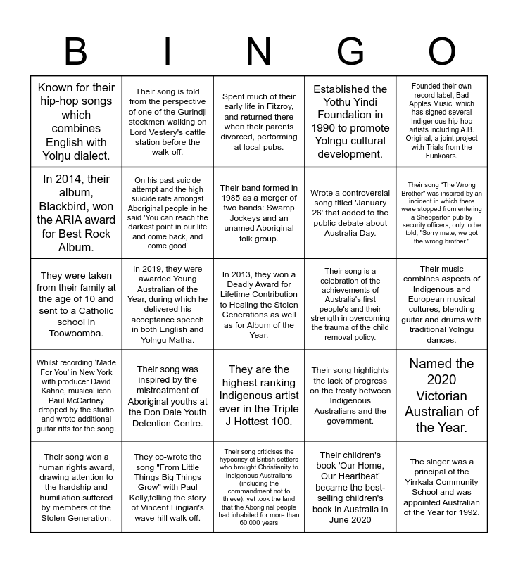 This bingo card has 25 words: Their song was inspired by the mistreatment of Aboriginal youths at the Don Dale Youth Detention Centre., Their song criticises the hypocrisy of British settlers who brought Christianity to Indigenous Australians (including the commandment not to thieve), yet took the land that the Aboriginal people had inhabited for more than 60,000 years, Their band formed in 1985 as a merger of two bands: Swamp Jockeys and an unamed Aboriginal folk group., Their song won a human rights award, drawing attention to the hardship and humiliation suffered by members of the Stolen Generation., Founded their own record label, Bad Apples Music, which has signed several Indigenous hip-hop artists including A.B. Original, a joint project with Trials from the Funkoars., Known for their hip-hop songs which combines English with Yolŋu dialect., In 2014, their album, Blackbird, won the ARIA award for Best Rock Album., Their song is told from the perspective of one of the Gurindji stockmen walking on Lord Vestery's cattle station before the walk-off., Their song is a celebration of the achievements of Australia's first people's and their strength in overcoming the trauma of the child removal policy., They are the highest ranking Indigenous artist ever in the Triple J Hottest 100., Wrote a controversial song titled 'January 26' that added to the public debate about Australia Day., They were taken from their family at the age of 10 and sent to a Catholic school in Toowoomba., Their song highlights the lack of progress on the treaty between Indigenous Australians and the government., Named the 2020 Victorian Australian of the Year., On his past suicide attempt and the high suicide rate amongst Aboriginal people in he said 'You can reach the darkest point in our life and come back, and come good', The singer was a principal of the Yirrkala Community School and was appointed Australian of the Year for 1992., Their music combines aspects of Indigenous and European musical cultures, blending guitar and drums with traditional Yolngu dances., Spent much of their early life in Fitzroy, and returned there when their parents divorced, performing at local pubs., Their song “The Wrong Brother" was inspired by an incident in which there were stopped from entering a Shepparton pub by security officers, only to be told, "Sorry mate, we got the wrong brother.", In 2019, they were awarded Young Australian of the Year, during which he delivered his acceptance speech in both English and Yolngu Matha., In 2013, they won a Deadly Award for Lifetime Contribution to Healing the Stolen Generations as well as for Album of the Year., They co-wrote the song "From Little Things Big Things Grow" with Paul Kelly,telling the story of Vincent Lingiari's wave-hill walk off., Whilst recording ‘Made For You’ in New York with producer David Kahne, musical icon Paul McCartney dropped by the studio and wrote additional guitar riffs for the song., Established the Yothu Yindi Foundation in 1990 to promote Yolngu cultural development. and Their children's book 'Our Home, Our Heartbeat' became the best-selling children's book in Australia in June 2020.