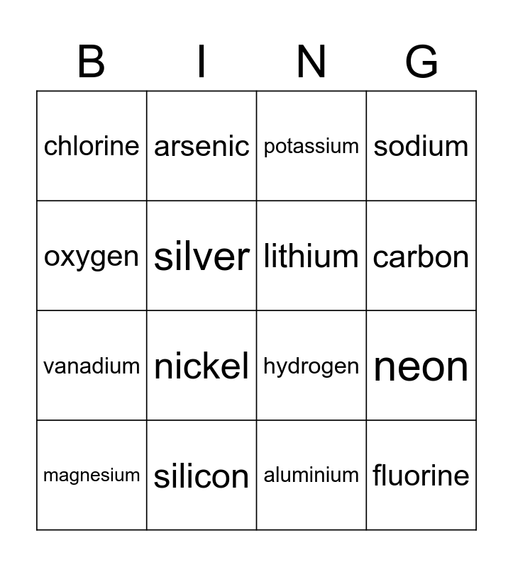 This bingo card has 41 words: Free!, hydrogen, helium, lithium, beryllium, boron, carbon, nitrogen, oxygen, fluorine, neon, sodium, magnesium, aluminium, silicon, phosphorus, sulphur, chlorine, argon, potassium, calcium, scandium, titanium, vanadium, chromium, manganese, iron, cobalt, nickel, copper, zinc, arsenic, krypton, rubidium, strontium, silver, tin, caesium, barium, gold and lead.