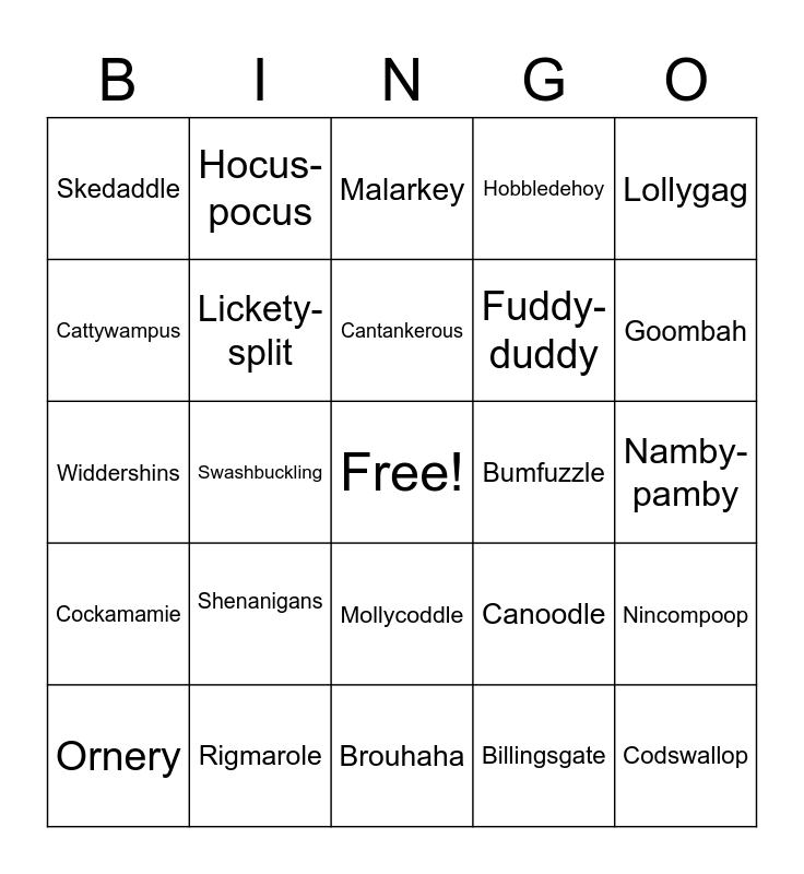 This bingo card has a free space and 24 words: Shenanigans, Rigmarole, Cantankerous, Ornery, Lollygag, Skedaddle, Cattywampus, Hocus-pocus, Bumfuzzle, Mollycoddle, Fuddy-duddy, Widdershins, Canoodle, Nincompoop, Lickety-split, Billingsgate, Namby-pamby, Malarkey, Goombah, Swashbuckling, Codswallop, Cockamamie, Hobbledehoy and Brouhaha.