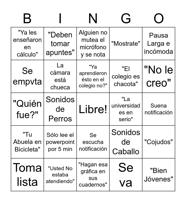 This bingo card has a free space and 24 words: Sólo lee el powerpoint por 5 min, "Usted No estaba atendiendo", "Ya aprendieron ésto en el colegio no?", Toma lista, Pausa Larga e incómoda, "Ya les enseñaron en cálculo", Se empvta, "Deben tomar apuntes", "La universidad es en serio", Se escucha notificación, "El colegio es chacota", "Quién fue?", Sonidos de Caballo, "Cojudos", La cámara está chueca, Se va, Suena notificación, Alguien no mutea el micrófono y se nota, "No le creo", Sonidos de Perros, "Bien Jóvenes", "Tu Abuela en Bicicleta", "Mostrate" and "Hagan esa gráfica en sus cuadernos".