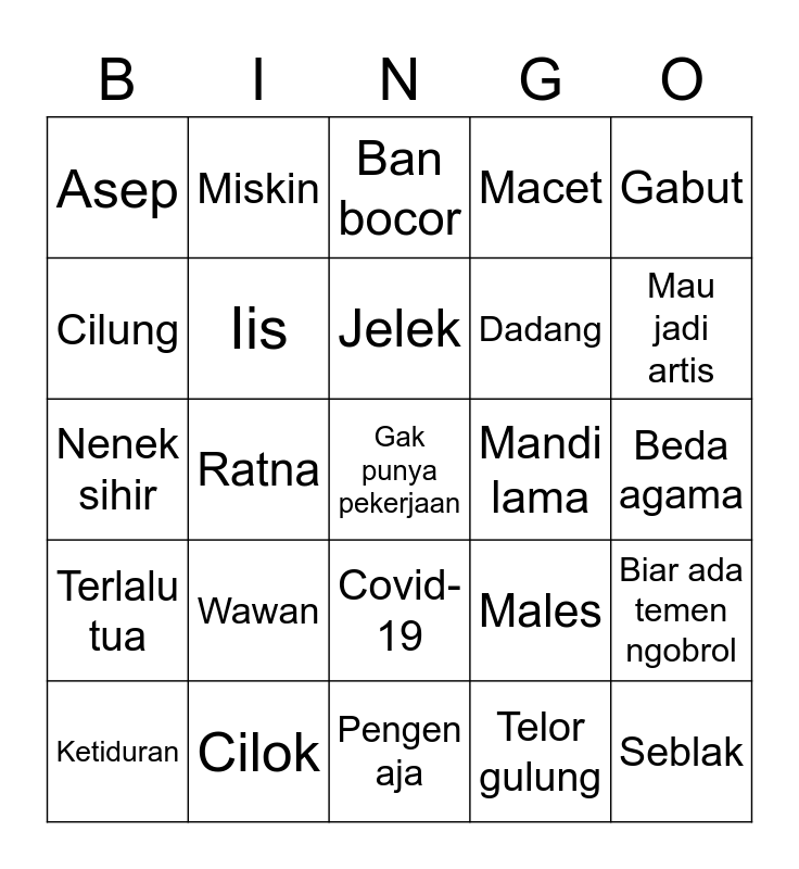 This bingo card has a free space and 24 words: Wawan, Cilok, Jelek, Ketiduran, Gabut, Asep, Cilung, Miskin, Mandi lama, Covid-19, Dadang, Nenek sihir, Males, Biar ada temen ngobrol, Iis, Telor gulung, Beda agama, Ban bocor, Mau jadi artis, Ratna, Seblak, Terlalu tua, Macet and Pengen aja.