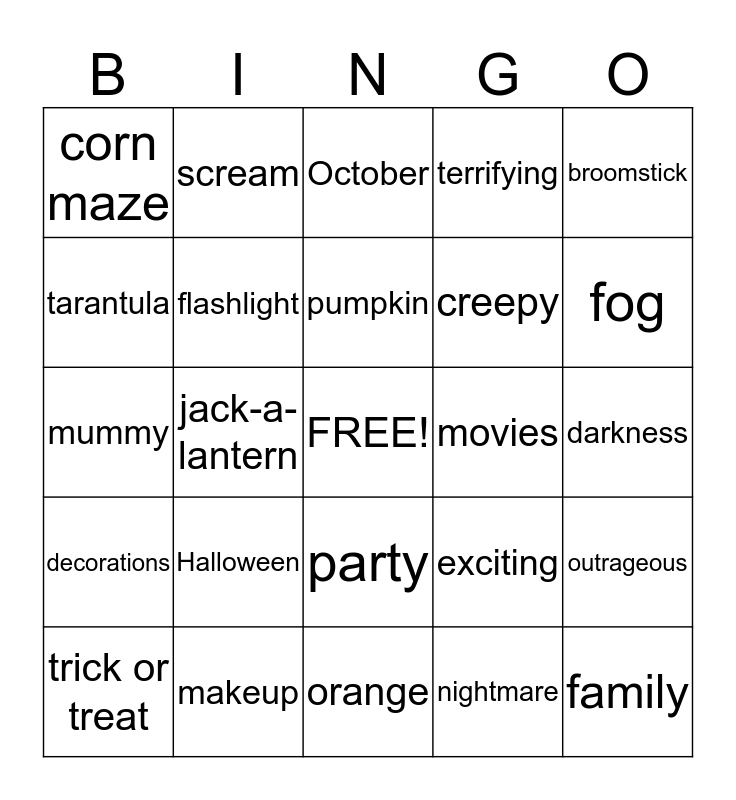 This bingo card has a free space and 24 words: Halloween, makeup, pumpkin, trick or treat, broomstick, corn maze, tarantula, scream, movies, party, creepy, mummy, exciting, outrageous, flashlight, nightmare, darkness, October, fog, jack-a-lantern, family, decorations, terrifying and orange.