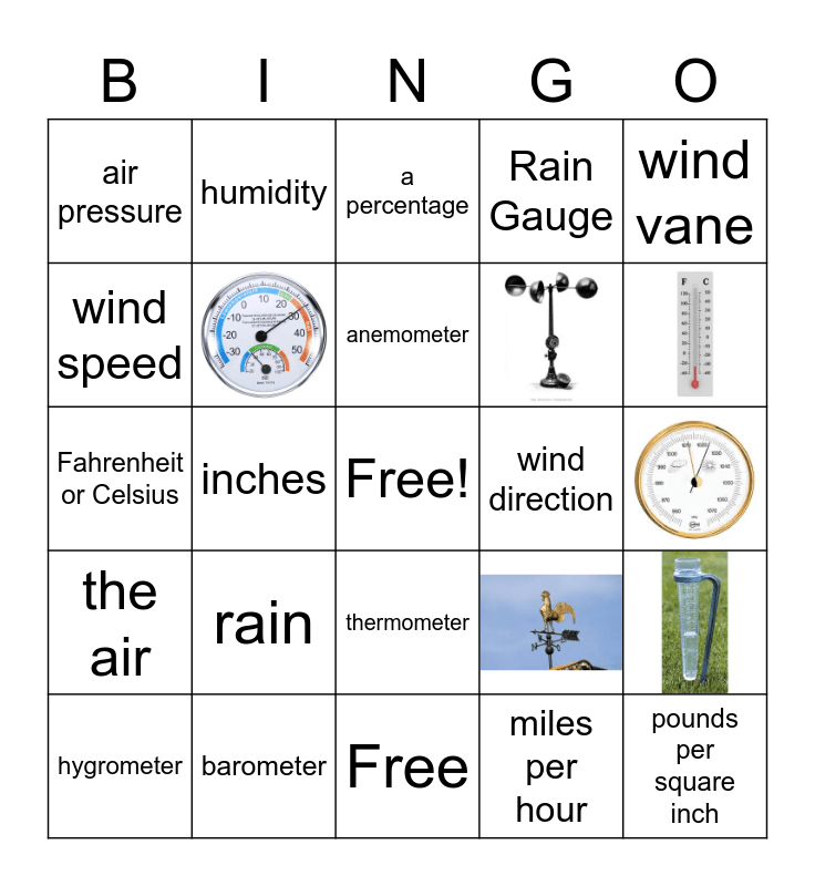 This bingo card has 6 images, a free space and 18 words: rain, barometer, anemometer, hygrometer, wind vane, air pressure, wind speed, humidity, wind direction, thermometer, Fahrenheit or Celsius, miles per hour, a percentage, inches, pounds per square inch, the air, Rain Gauge and Free.