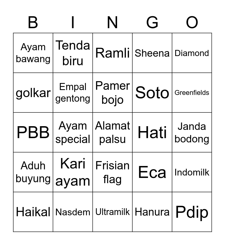 This bingo card has a free space and 24 words: Kari ayam, Nasdem, Pamer bojo, Haikal, Diamond, Ayam bawang, golkar, Tenda biru, Hati, Frisian flag, Soto, PBB, Eca, Indomilk, Empal gentong, Hanura, Janda bodong, Ramli, Greenfields, Ayam special, Pdip, Aduh buyung, Sheena and Ultramilk.
