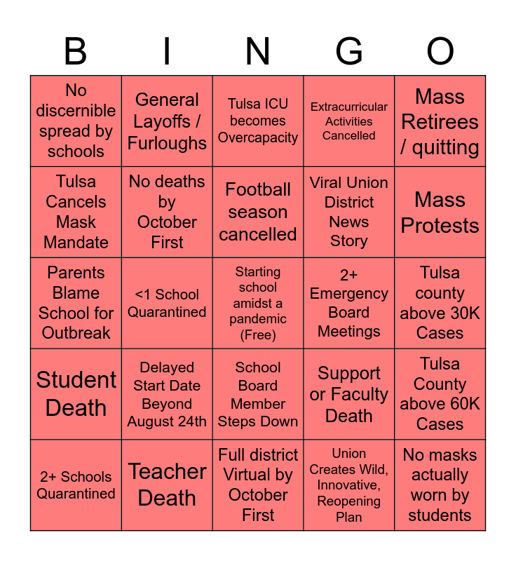 This bingo card has a free space and 24 words: Delayed Start Date Beyond August 24th, Teacher Death, Football season cancelled, 2+ Schools Quarantined, Mass Retirees / quitting, No discernible spread by schools, Tulsa Cancels Mask Mandate, General Layoffs / Furloughs, 2+ Emergency Board Meetings, School Board Member Steps Down, Viral Union District News Story, Parents Blame School for Outbreak, Support or Faculty Death, Tulsa County above 60K Cases, No deaths by October First, Union Creates Wild, Innovative, Reopening Plan, Tulsa county above 30K Cases, Tulsa ICU becomes Overcapacity, Mass Protests, <1 School Quarantined, No masks actually worn by students, Student Death, Extracurricular Activities Cancelled and Full district Virtual by October First.