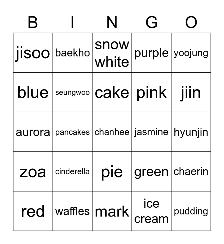 This bingo card has 25 words: cinderella, mark, cake, red, yoojung, jisoo, blue, baekho, jasmine, pie, pink, aurora, green, chaerin, seungwoo, pudding, hyunjin, snow white, jiin, pancakes, chanhee, waffles, zoa, purple and ice cream.