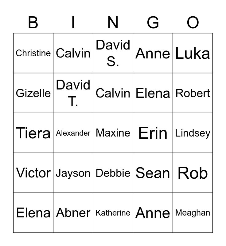 This bingo card has 30 words: Abner, Alexandra, Alexander, Asim, Christine, David S., David T., Debbie, Erin, Katherine, Lindsey, Maxine, Anne, Meaghan, Robert, Sarah, Sean, Victor, Jayson, Luka, Tiera, Rob, Calvin, Elena, Gizelle, Anne, Rob, Elena, Calvin and Gizelle.