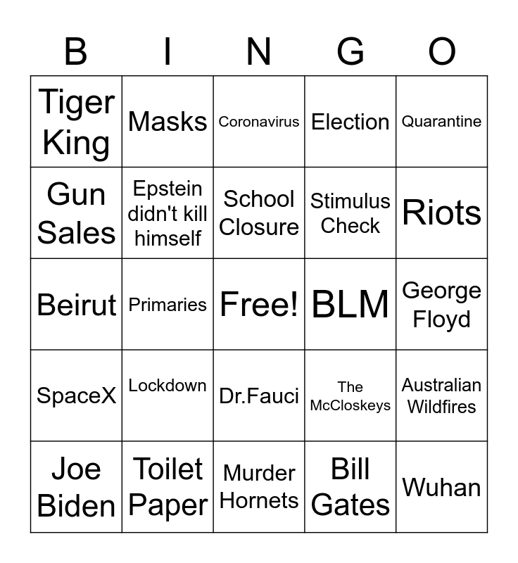 This bingo card has a free space and 44 words: Covid-19, Wuhan, Donald Trump, Joe Biden, Vaccine, Bill Gates, Coronavirus, Bats, Quarantine, Toilet Paper, Election, BLM, Dr.Fauci, Lockdown, Pandemic, Murder Hornets, Kobe Bryant, Beirut, Wayfair Scandal, Riots, Masks, Impeachment Trial, Brexit, Tiger King, UFOs, George Floyd, CHAZ, Social Distancing, The McCloskeys, SpaceX, NBA Bubble, Australian Wildfires, Qassem Soleimani, WHO, Primaries, Prince Harry and Meghan Markle, Harvey Weinstein, Stock Market, School Closure, Gun Sales, Stimulus Check, Hydroxychloroquine, Epstein didn't kill himself and Big Tech Censorship.