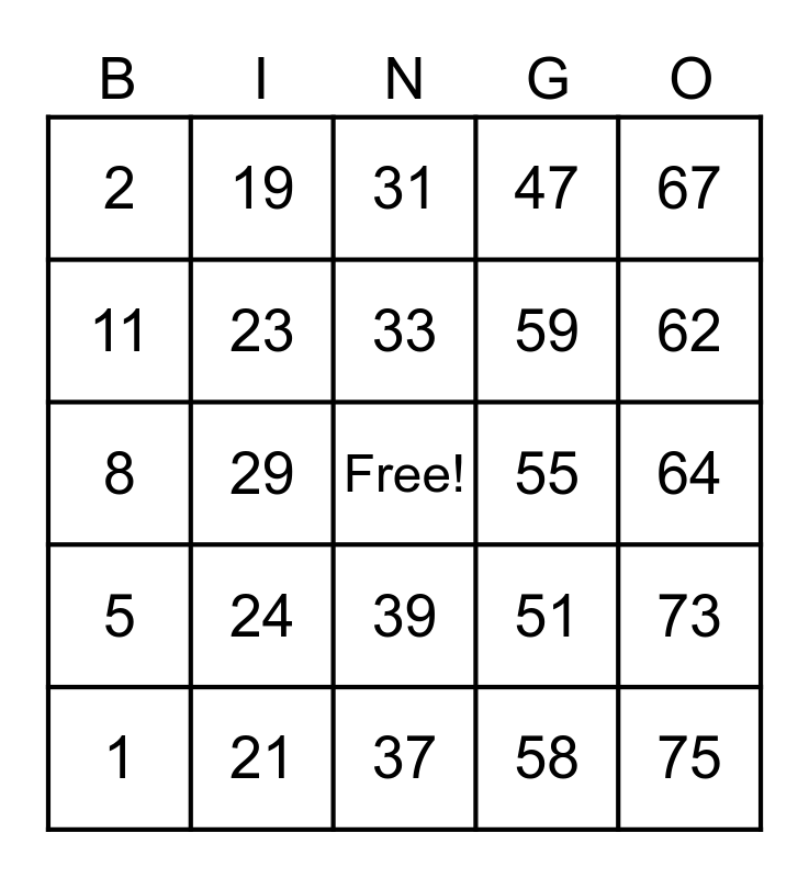 This bingo card has a free space and 24 words: 1, 24, 33, 58, 67, 2, 19, 31, 55, 64, 8, 23, 51, 73, 11, 21, 37, 47, 62, 5, 29, 39, 59 and 75.