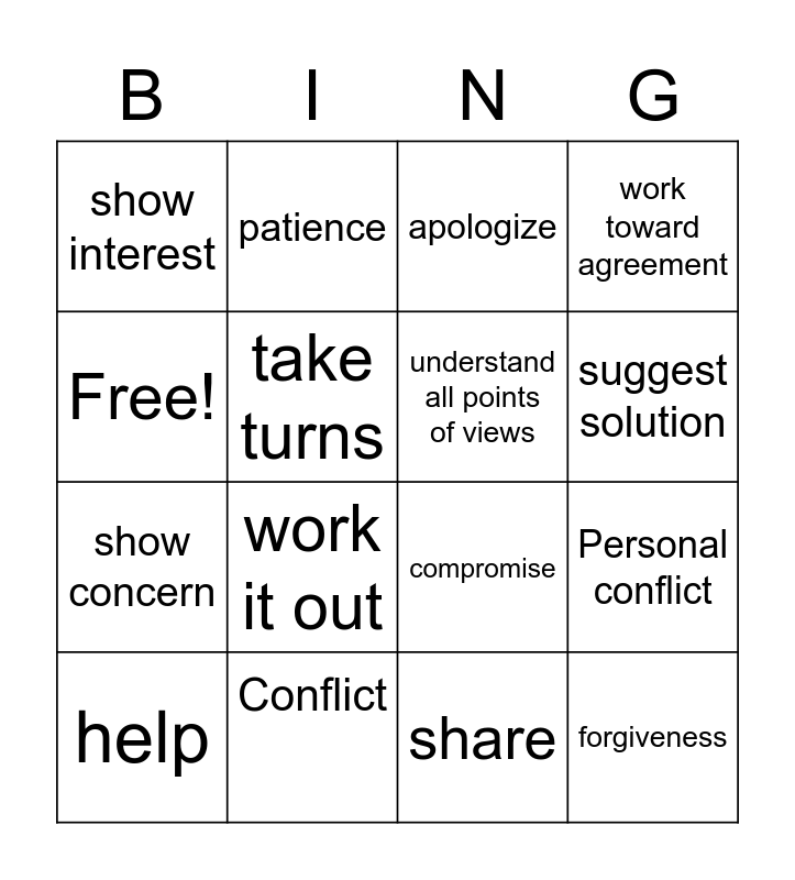 This bingo card has 16 words: Conflict, Personal conflict, apologize, show interest, show concern, patience, compromise, share, Free!, take turns, help, work toward agreement, work it out, suggest solution, understand all points of views and forgiveness.
