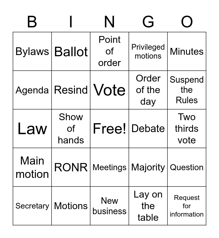 This bingo card has a free space and 24 words: RONR, Motions, Vote, Secretary, Minutes, Bylaws, Agenda, Ballot, Debate, Meetings, Order of the day, Law, Majority, Question, Resind, Lay on the table, Two thirds vote, Point of order, Suspend the Rules, Show of hands, Request for information, Main motion, Privileged motions and New business.