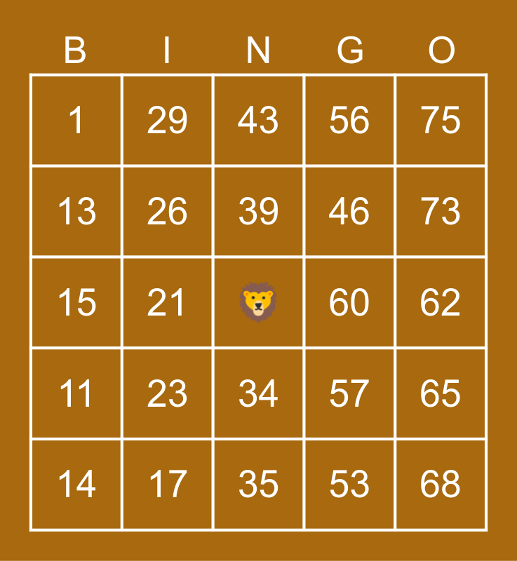 This bingo card has a free space and 24 words: 14, 23, 39, 53, 75, 1, 29, 43, 60, 62, 15, 26, 57, 65, 13, 17, 35, 56, 73, 11, 21, 34, 46 and 68.