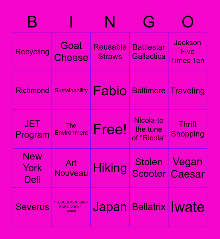 This bingo card has a free space and 29 words: Severus, Maddox, The Environment, Vegan Snacks, Recycling, Reusable Straws, Sustainability, Art Nouveau, Nicola-to the tune of "Ricola", "FUUUUUCCCKKKK SCHOOOOL" - Jason, Thrift Shopping, Iwate, Japan, Bellatrix, Traveling, Camping, Hiking, New York Deli, Jackson Five Times Ten, JET Program, Stolen Scooter, 303 S. Pine St., Baltimore, Richmond, Battlestar Gallactica, Goat Cheese, Vegan Caesar, Fabio and Milk Jug.
