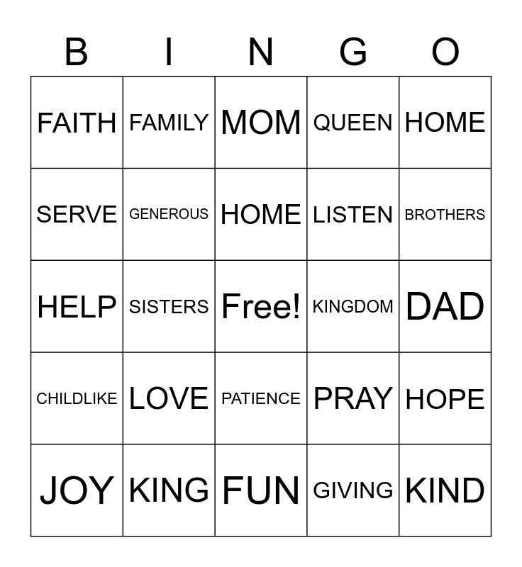 This bingo card has a free space and 24 words: LOVE, KING, HOME, JOY, HOME, FAITH, SERVE, FAMILY, KINGDOM, PATIENCE, LISTEN, HELP, PRAY, HOPE, GENEROUS, GIVING, DAD, MOM, BROTHERS, SISTERS, KIND, CHILDLIKE, QUEEN and FUN.
