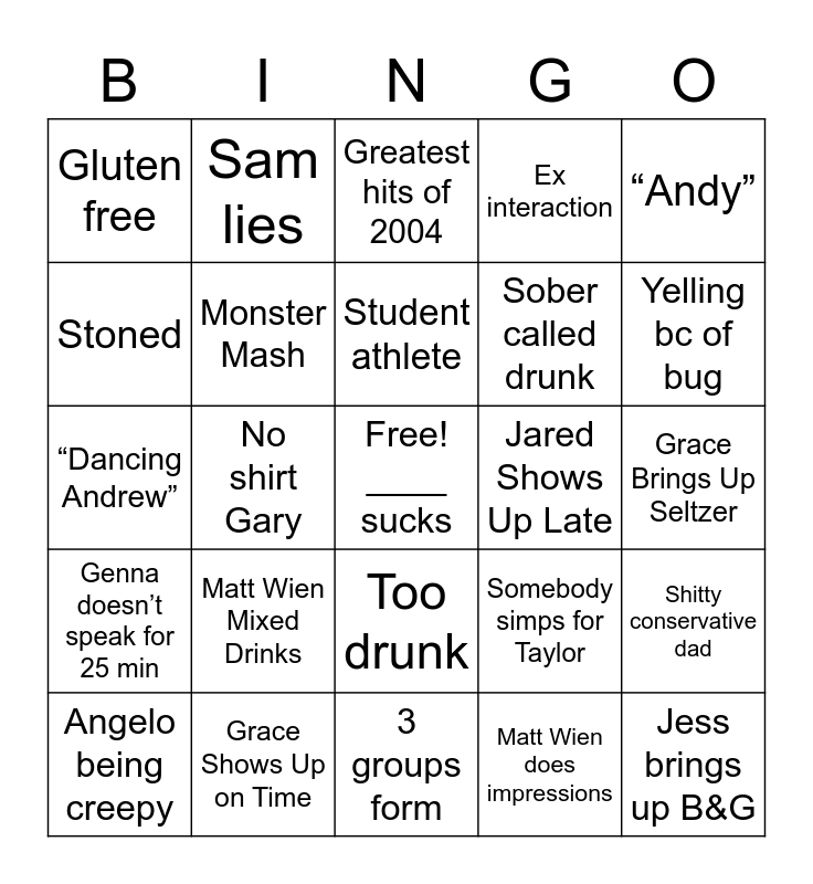 This bingo card has a free space and 29 words: Angelo being creepy, Amanda dating stories, No shirt Gary, Smirnoff RW&B, Gluten free, Greatest hits of 2004, Monster Mash, Matt Wien Mixed Drinks, Jared Shows Up Late, Grace Shows Up on Time, Grace Brings Up Seltzer, Jess brings up B&G, 3 groups form, Matt Wien does impressions, Yelling bc of bug, “Gay”, Too drunk, Genna doesn’t speak for 25 min, “Andy”, “Dancing Andrew”, Somebody simps for Taylor, Sibling, Sober called drunk, Stoned, Ex interaction, Sam lies, Shitty conservative dad, Student athlete and Misogyny.