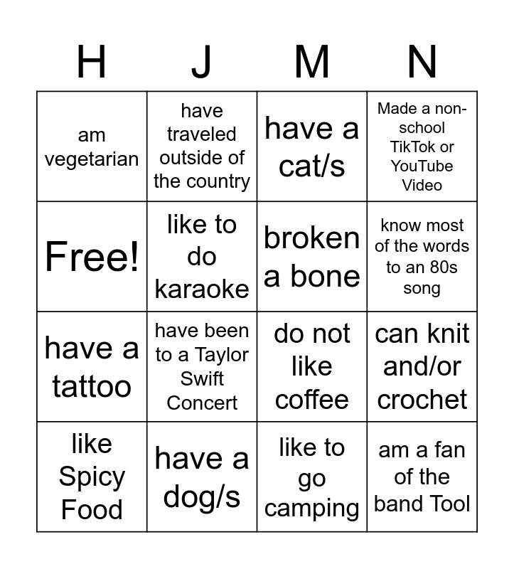This bingo card has 16 words: have a dog/s, can knit and/or crochet, have a cat/s, am vegetarian, have a tattoo, have traveled outside of the country, do not like coffee, like to go camping, Free!, like to do karaoke, like Spicy Food, Made a non-school TikTok or YouTube Video, have been to a Taylor Swift Concert, know most of the words to an 80s song, broken a bone and am a fan of the band Tool.