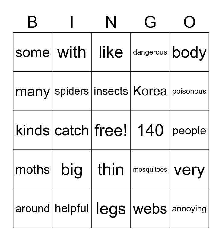 This bingo card has a free space and 24 words: big, helpful, insects, around, body, some, many, with, 140, thin, Korea, kinds, mosquitoes, very, spiders, webs, people, like, poisonous, catch, annoying, moths, dangerous and legs.