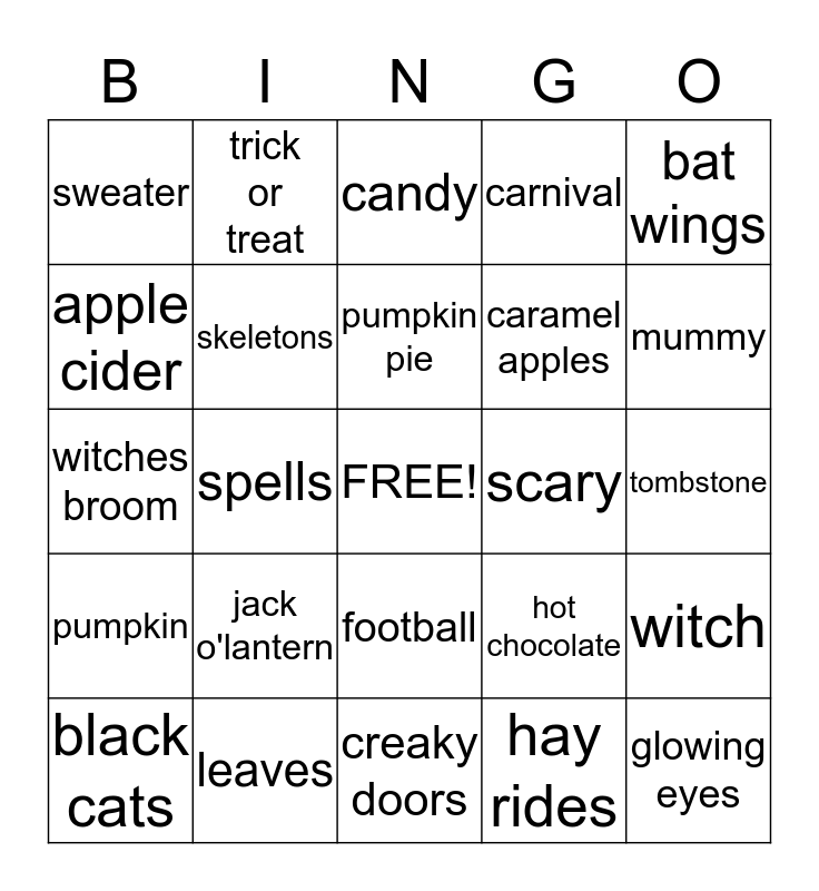 This bingo card has a free space and 24 words: jack o'lantern, leaves, pumpkin pie, black cats, bat wings, sweater, apple cider, trick or treat, scary, football, caramel apples, witches broom, hot chocolate, witch, skeletons, hay rides, tombstone, candy, mummy, spells, glowing eyes, pumpkin, carnival and creaky doors.