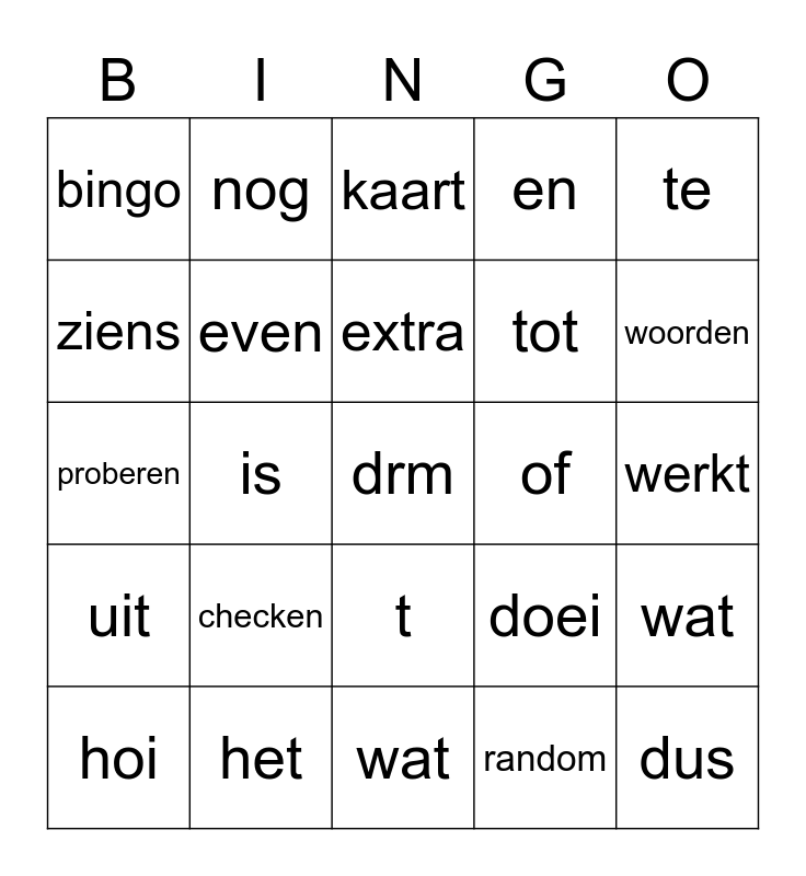 This bingo card has 1 images, a free space and 28 words: hoi, dit, is, een, bingo, kaart, even, checken, of, het, werkt, dus, wat, random, woorden, om, t, uit, te, proberen, doei, dag, tot, ziens, en, nog, wat and extra.
