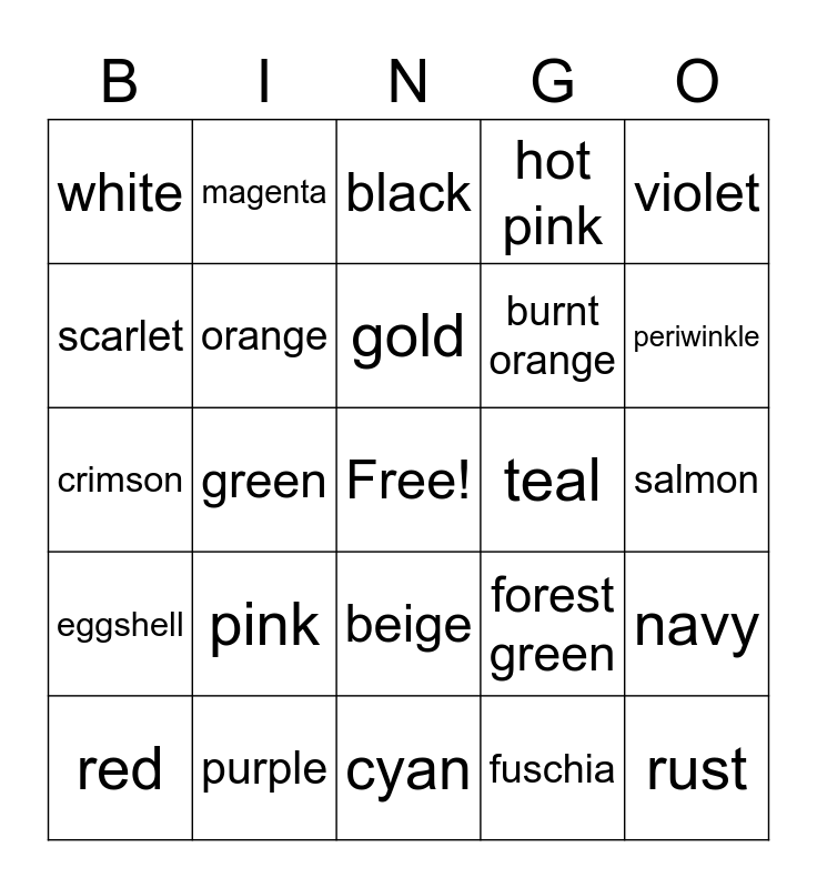 This bingo card has a free space and 29 words: red, blue, green, yellow, white, black, orange, pink, teal, purple, salmon, rust, cyan, fuschia, periwinkle, tan, beige, eggshell, violet, crimson, forest green, lime green, burnt orange, scarlet, hot pink, magenta, navy, gold and royal blue.