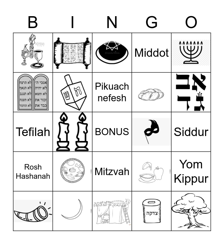 This bingo card has 17 images, a free space and 7 words: Pikuach nefesh, Siddur, Tefilah, Yom Kippur, Middot, Rosh Hashanah and Mitzvah.