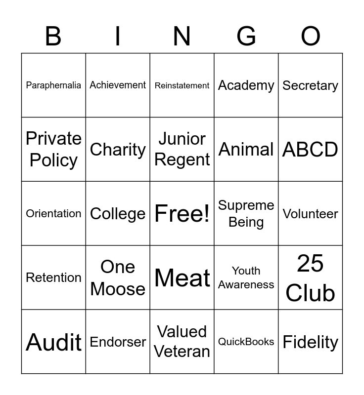 This bingo card has a free space and 37 words: Endowment, Senior Regent, Faith, Charity, 25 Club, One Moose, Junior Regent, Recorder, Secretary, Dispensation, College, Academy, Fidelity, Volunteer, Private Policy, Retention, Transfer, Reinstatement, Meat, Supreme Being, Paraphernalia, ABCD, Audit, Valued Veteran, LCL, QuickBooks, Achievement, Loyalty, Teamwork, Agenda, Governor, Endorser, Orientation, FMA, Youth Awareness, Animal and Moose Legion.