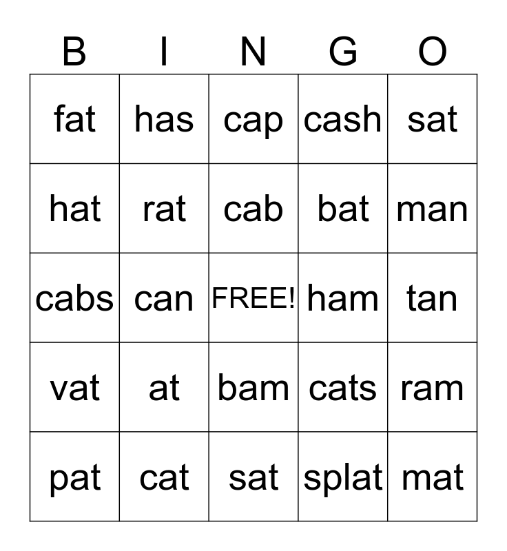 This bingo card has a free space and 24 words: at, cat, cab, pat, sat, fat, hat, has, ham, bam, bat, cabs, cats, ram, rat, splat, tan, cap, man, can, mat, vat, cash and sat.