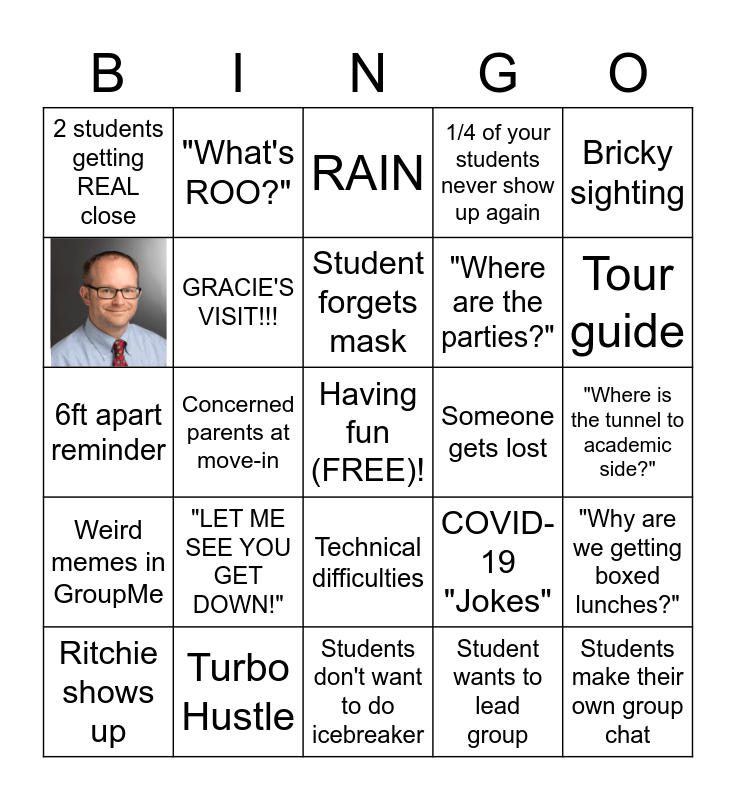 This bingo card has 1 images, a free space and 23 words: "LET ME SEE YOU GET DOWN!", Turbo Hustle, Student forgets mask, Ritchie shows up, Bricky sighting, 2 students getting REAL close, "What's ROO?", Someone gets lost, Technical difficulties, "Where are the parties?", 6ft apart reminder, COVID-19 "Jokes", "Why are we getting boxed lunches?", GRACIE'S VISIT!!!, Student wants to lead group, "Where is the tunnel to academic side?", RAIN, Tour guide, Concerned parents at move-in, Students make their own group chat, Weird memes in GroupMe, 1/4 of your students never show up again and Students don't want to do icebreaker.