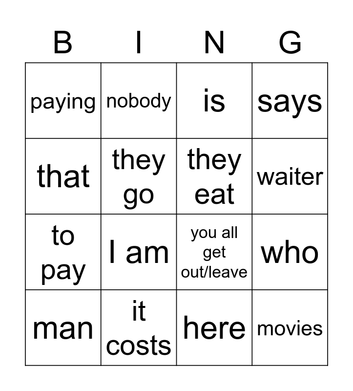 This bingo card has 16 words: it costs, who, is, paying, to pay, nobody, you all get out/leave, here, that, they go, man, says, I am, waiter, they eat and movies.