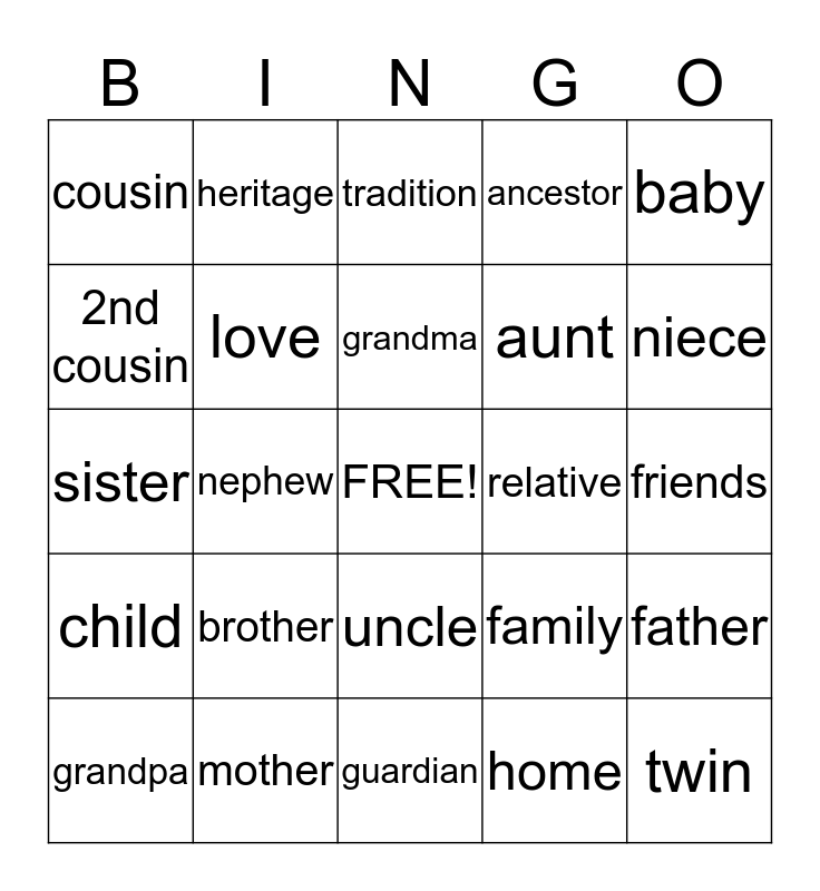 This bingo card has a free space and 24 words: brother, mother, grandma, grandpa, baby, cousin, 2nd cousin, heritage, relative, uncle, aunt, sister, family, father, love, home, friends, tradition, niece, nephew, twin, child, ancestor and guardian.