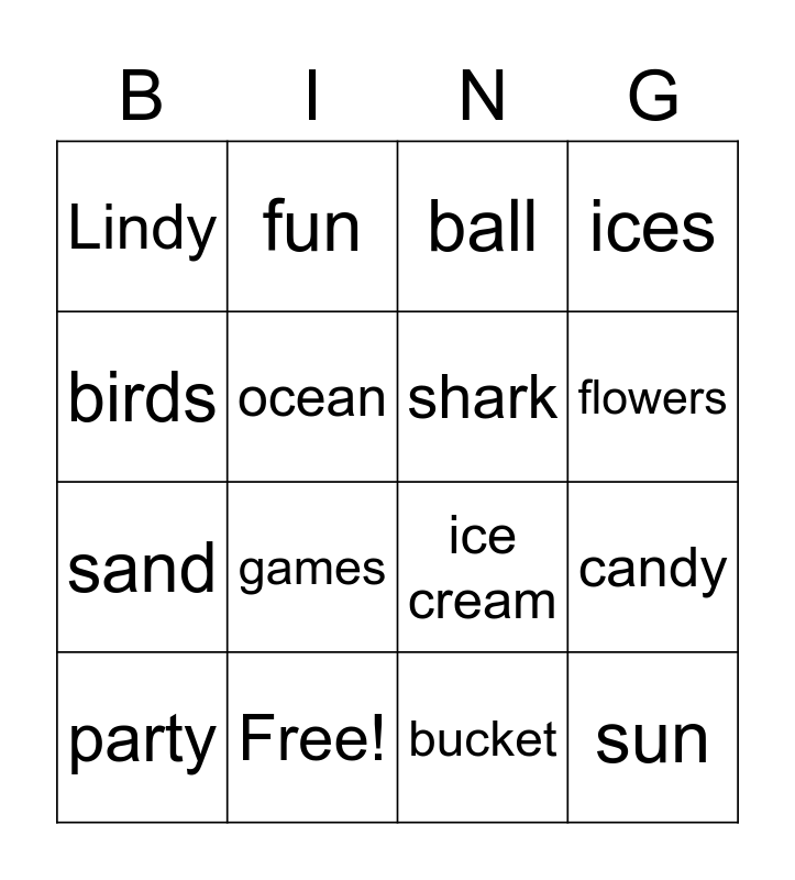 This bingo card has 28 words: pool, beach, sand, kite, ocean, ball, fun, sun, Free!, read, ice cream, ices, friends, trips, games, music, turtle, shark, flowers, kayak, Lindy, swim, party, candy, bucket, shovel, birds and vacation.