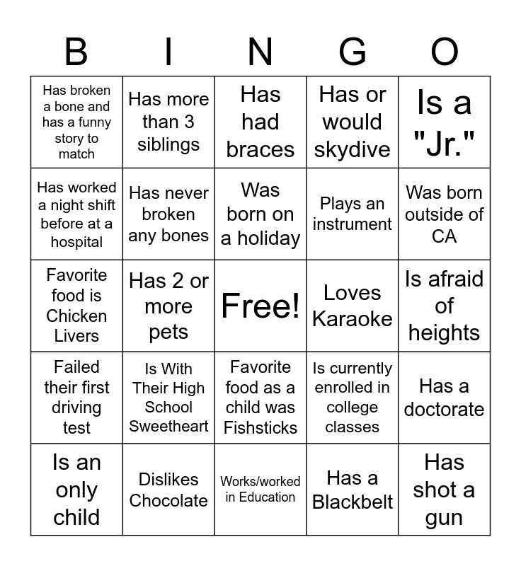 This bingo card has a free space and 24 words: Is With Their High School Sweetheart, Dislikes Chocolate, Was born on a holiday, Is an only child, Is a "Jr.", Has broken a bone and has a funny story to match, Has worked a night shift before at a hospital, Has more than 3 siblings, Loves Karaoke, Favorite food as a child was Fishsticks, Plays an instrument, Favorite food is Chicken Livers, Is currently enrolled in college classes, Has a doctorate, Has never broken any bones, Has a Blackbelt, Is afraid of heights, Has had braces, Was born outside of CA, Has 2 or more pets, Has shot a gun, Failed their first driving test, Has or would skydive and Works/worked in Education.