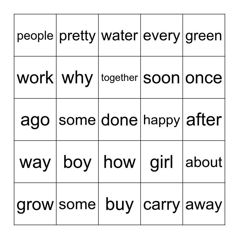 This bingo card has 33 words: away, now, some, today, way, why, green, grow, pretty, should, together, water, any, from, happy, once, some, ago, boy, girl, how, old, people, after, buy, done, every, soon, work, about, animal, carry and eight.