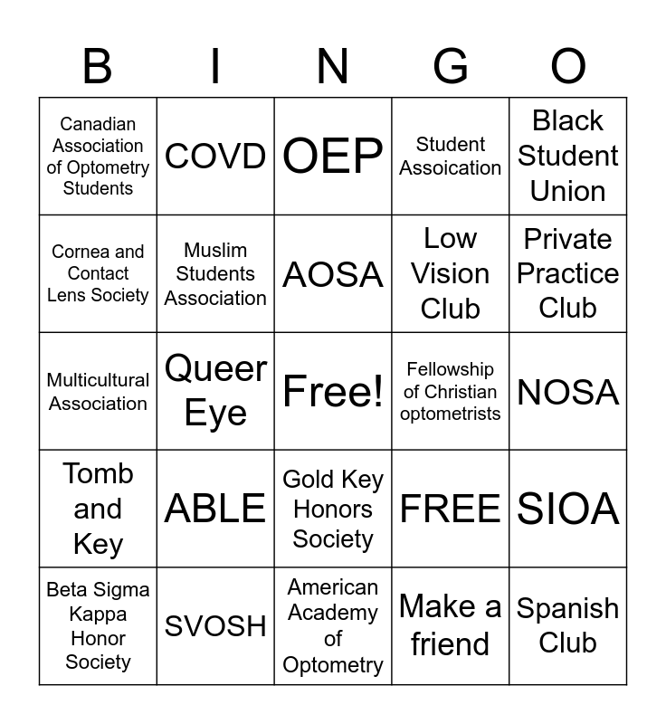 This bingo card has a free space and 25 words: ABLE, American Academy of Optometry, AOSA, Beta Sigma Kappa Honor Society, Black Student Union, Canadian Association of Optometry Students, Cornea and Contact Lens Society, COVD, Fellowship of Christian optometrists, Gold Key Honors Society, Low Vision Club, Multicultural Association, FREE, SIOA, Muslim Students Association, NORA, NOSA, OEP, Private Practice Club, Queer Eye, Spanish Club, SVOSH, Tomb and Key, Student Assoication and Make a friend.