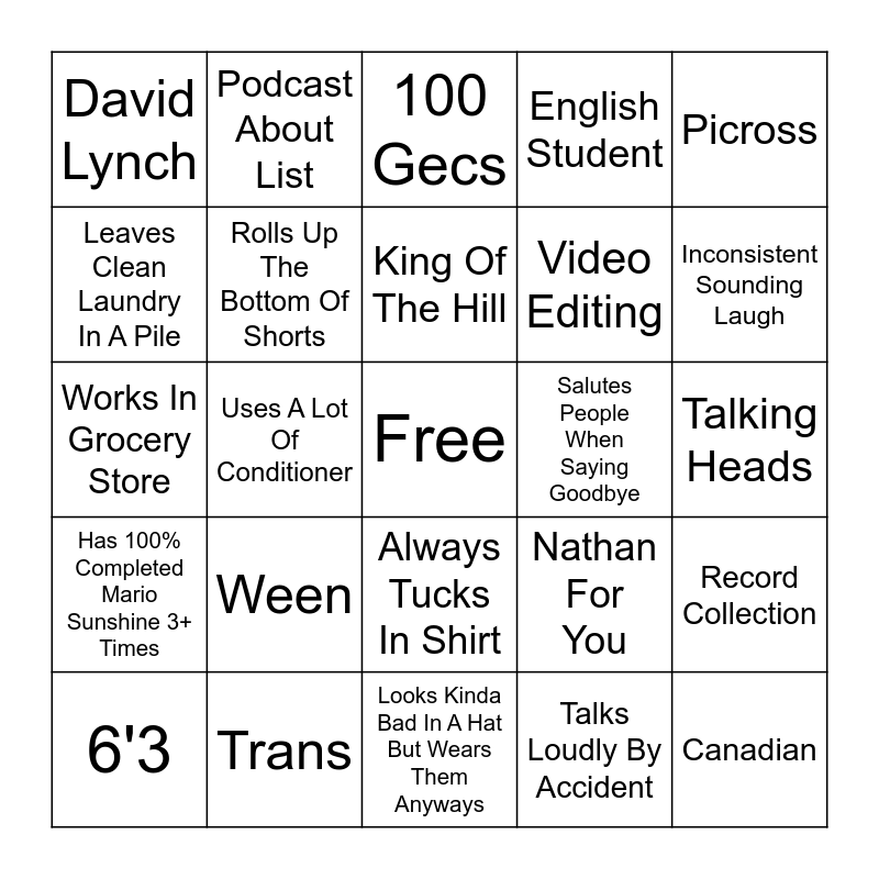 This bingo card has a free space and 24 words: Ween, Trans, King Of The Hill, 6'3, Picross, David Lynch, Leaves Clean Laundry In A Pile, Podcast About List, Salutes People When Saying Goodbye, Always Tucks In Shirt, Video Editing, Works In Grocery Store, Nathan For You, Record Collection, Rolls Up The Bottom Of Shorts, Talks Loudly By Accident, Talking Heads, 100 Gecs, Inconsistent Sounding Laugh, Uses A Lot Of Conditioner, Canadian, Has 100% Completed Mario Sunshine 3+ Times, English Student and Looks Kinda Bad In A Hat But Wears Them Anyways.