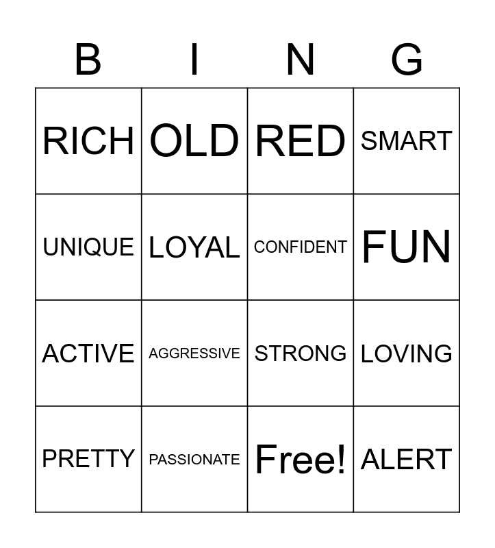 This bingo card has 17 words: Free!, PRETTY, RED, RICH, AGGRESSIVE, SMART, LOVING, CONFIDENT, FUN, LOYAL, PASSIONATE, STRONG, UNIQUE, OLD, ACTIVE, ENERGETIC and ALERT.